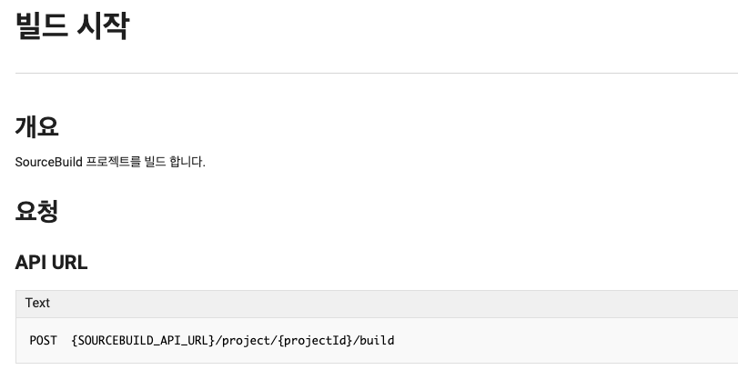 그리고 URI에는 공식 문서에서 각자 원하는 요청을 찾는다. 나는 SourceBuild에 "빌드 시작" API를 사용하고 싶어서 찾은 결과 밑에와 같다.